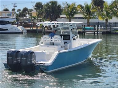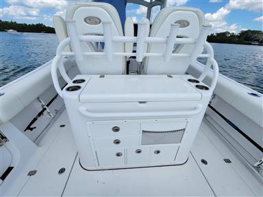 With twin 300 HP Yamaha 4 Stoke,Motor Recently Services, Auto Pilot and Power Winch, Joy Stick that helps both motor to pull in to a dock, SS/Prop, 5 batteries, 3 switches,compass, Simrad Dual in dash GPS, AM/FM, fish finder, VHF w/ distress, depth finder, trim tabs, rocket launchers, docking lights, LED underwater lights, T-top misters, console covers, walk-through transom, tackle station, tackle storage, 1 bat well & 1 live well, 2 fish boxes with macarator, rod holders, pop-up cleats, bow filler cushion with auto forward Table that goes up & down to use as a table or lower to use the bow cushion for comfort, adjustable captain's chair w/ cushions & bolsters, captain's chair w/o cushions & bolster, Porti-Potty w/ Holding Tank head w/ macerator, sink, Located in Nokomis, FL. No Trailer