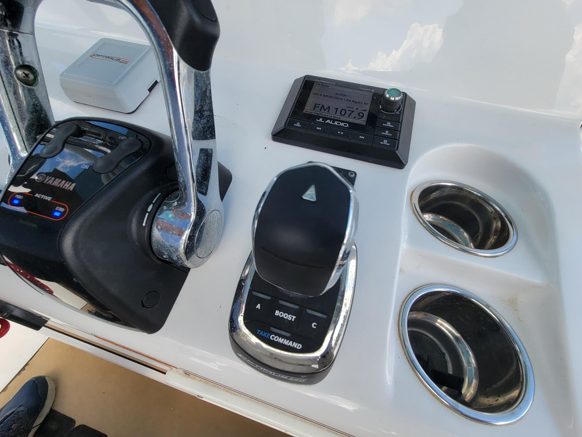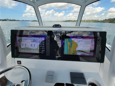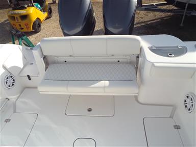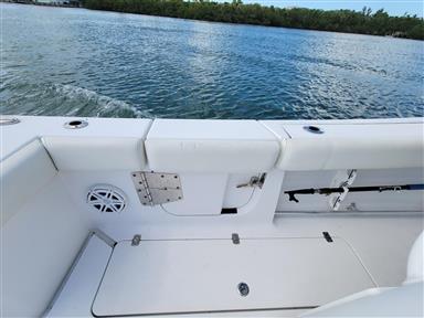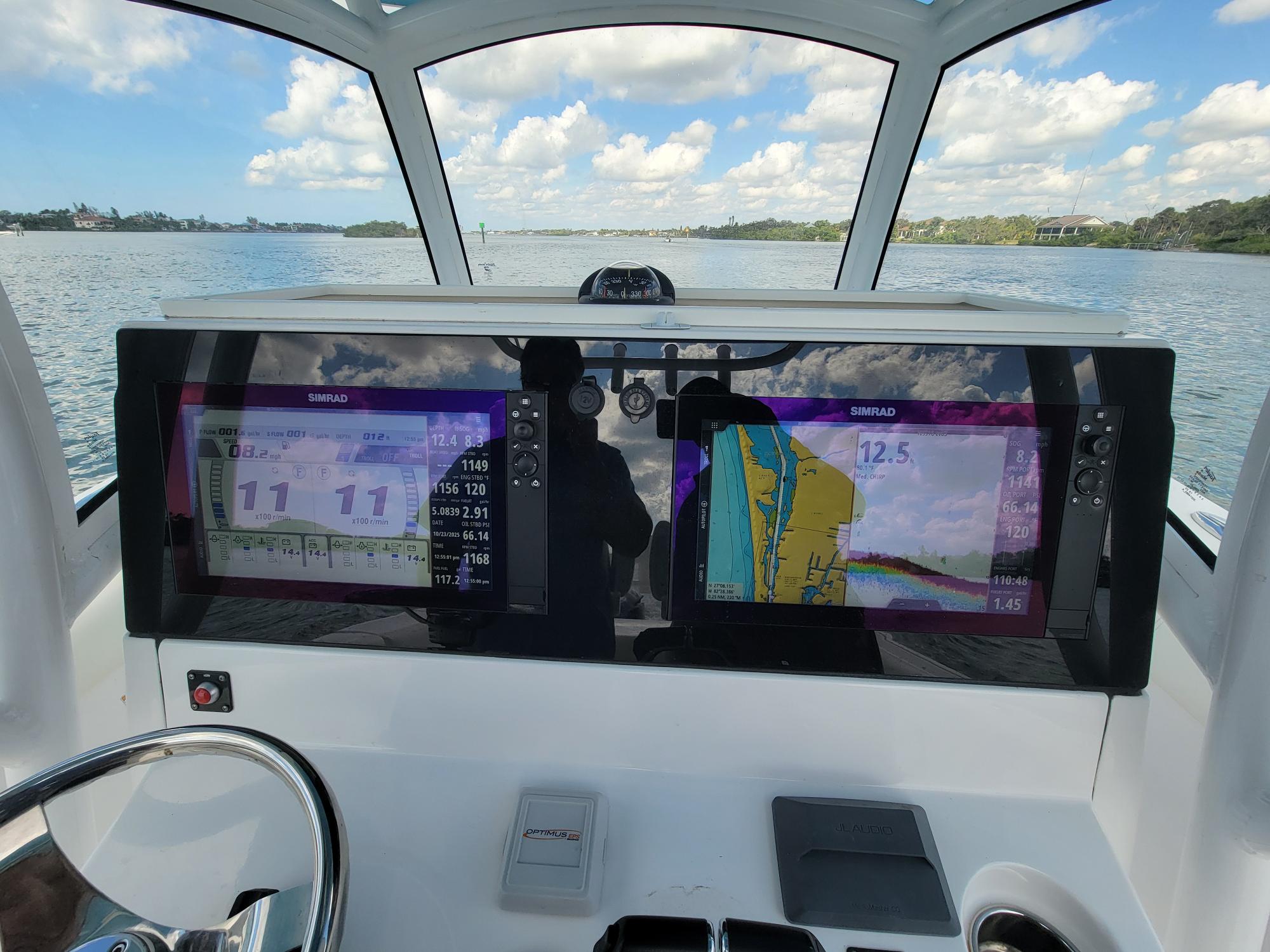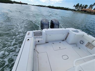 With twin 300 HP Yamaha 4 Stoke,Motor Recently Services, Auto Pilot and Power Winch, Joy Stick that helps both motor to pull in to a dock, SS/Prop, 5 batteries, 3 switches,compass, Simrad Dual in dash GPS, AM/FM, fish finder, VHF w/ distress, depth finder, trim tabs, rocket launchers, docking lights, LED underwater lights, T-top misters, console covers, walk-through transom, tackle station, tackle storage, 1 bat well & 1 live well, 2 fish boxes with macarator, rod holders, pop-up cleats, bow filler cushion with auto forward Table that goes up & down to use as a table or lower to use the bow cushion for comfort, adjustable captain's chair w/ cushions & bolsters, captain's chair w/o cushions & bolster, Porti-Potty w/ Holding Tank head w/ macerator, sink, Located in Nokomis, FL. No Trailer
