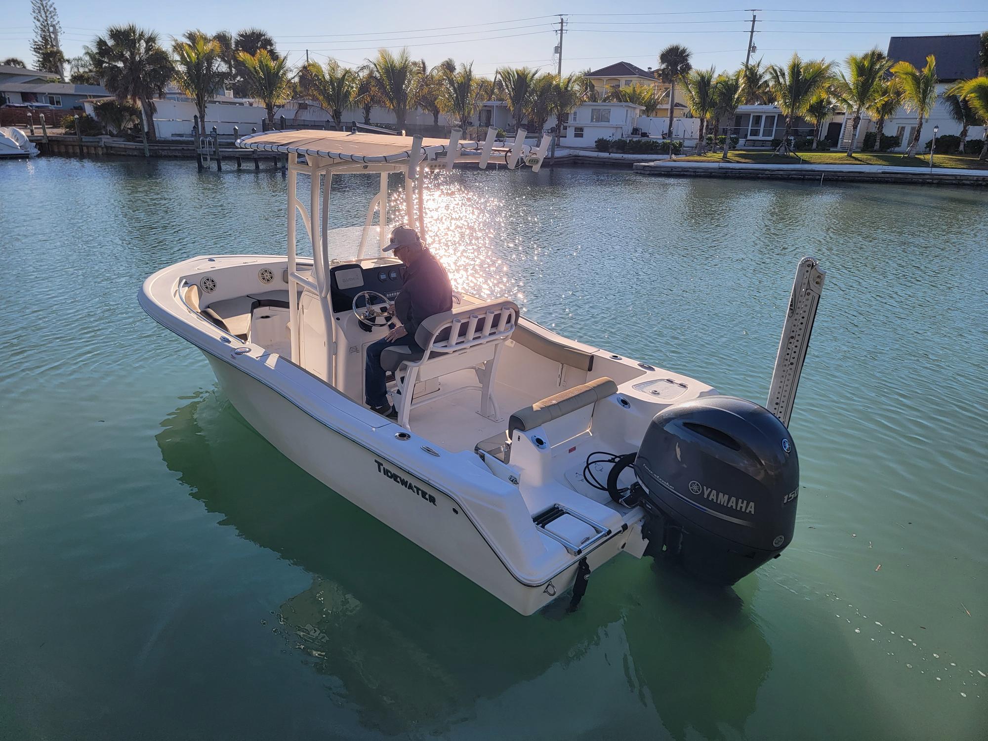 Clean 2020 21' Tidewater 210 Adventure ready to go to the water. Must see this well care for fishing boat. With 150 HP 4 Stroke Yamaha motor, 2 Batteries, on/off switch, trim tabs, canvas t-top, walk-through transom, live well, fish box, rod holders, pop-up cleats, bow filler cushion, rear bench seat, leaning post w/ fold-down foot rest, compass, Garmin GPS, AM/FM, Garmin fish finder, depth finder, Blade Power Pole and a Road King Tandem trailer that comes with this fishing boat. Located in Nokomis, FL. Call Dave at 888-256-0339 or email sales@cmcboats.com for more information.